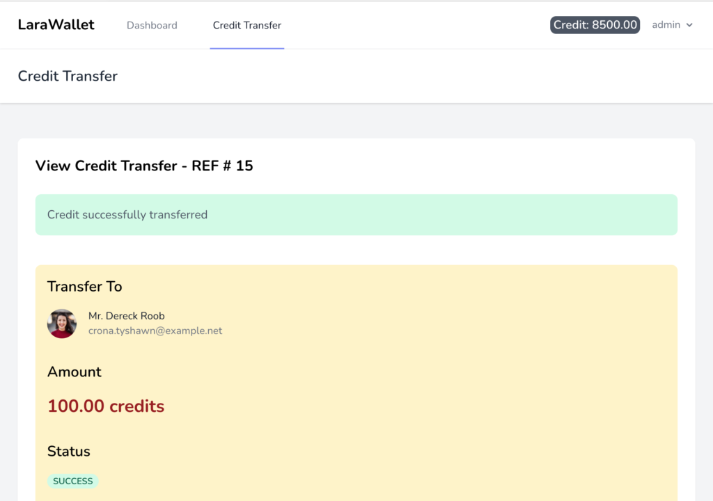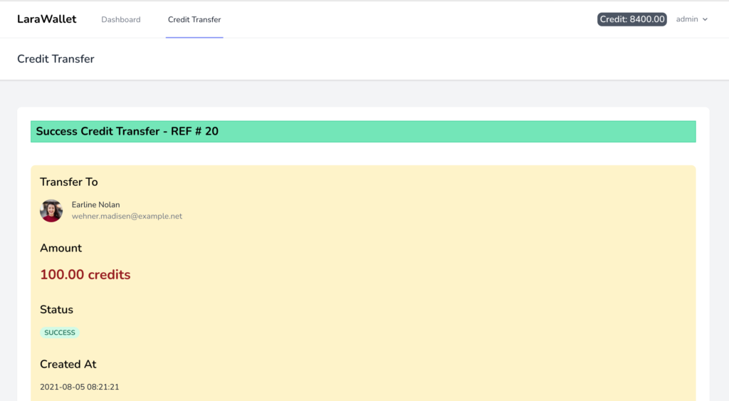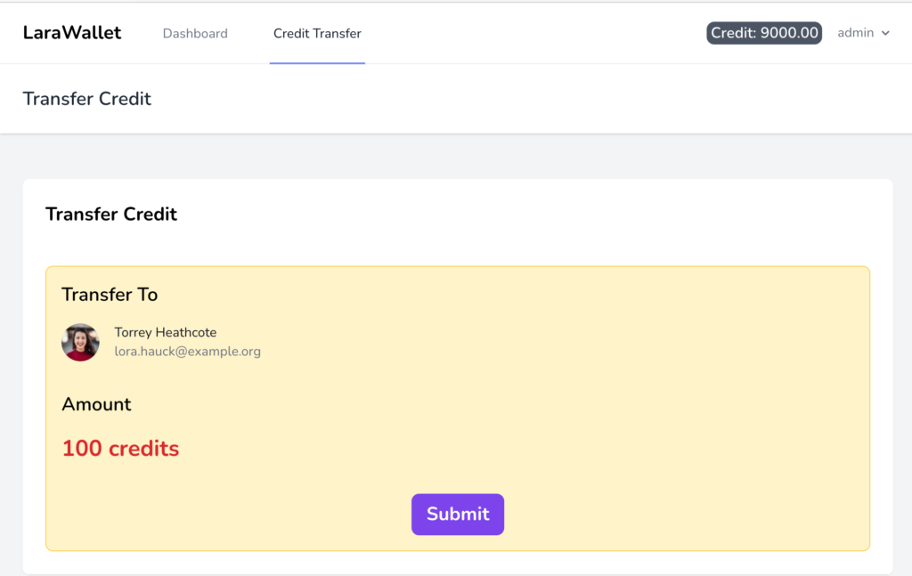 - The sample project that we cloned is a simple Wallet app called LaraWallet. The user can transfer credits to another registered user.